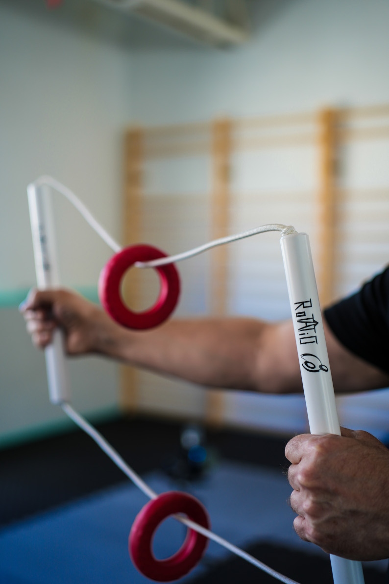 Prostota działania zestawu treningowego ROTATIO powoduję, że podczas ćwiczeń wzmacniane są w pierwszej kolejności mięśnie obręczy barkowej. Odpowiednie rozciągnięcie gum pozwala na dobranie właściwego obciążenia według indywidualnych potrzeb ćwiczącego. Utrzymanie krążków w ruchu obrotowym powoduje aktywację mięśni głębokich, stabilizatorów postawy ciała. Dodatkowo ćwiczący może w trakcie treningu wykonywać skręty tułowia aktywując tym samym również mięśnie skośne brzucha.